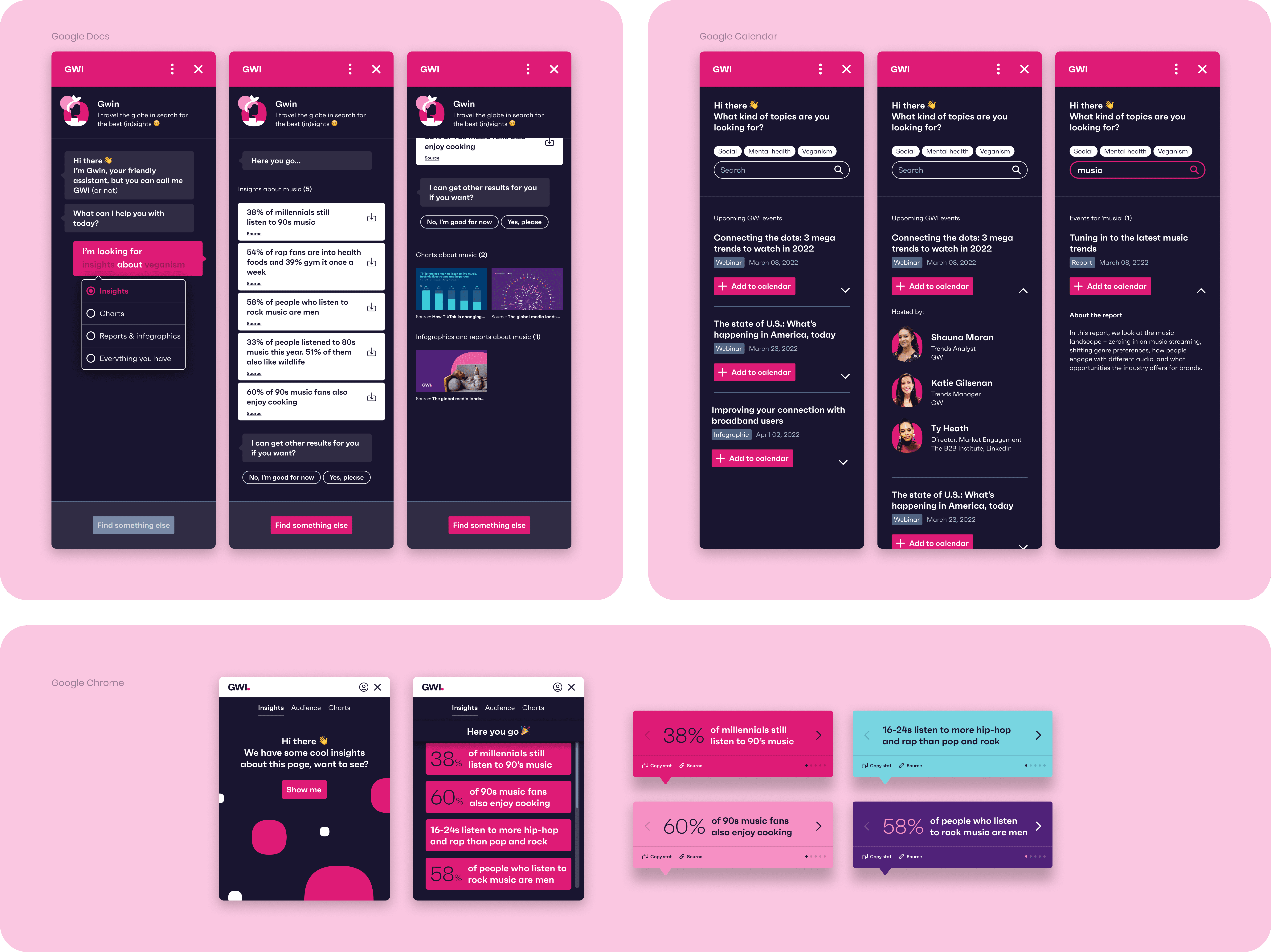 GWI is a leading market research and audience insight company that provides data on the behaviours, attitudes, and interests of global consumers. To envision the product's 5-year future, the product team conducted a rapid Design Innovation Sprint. The goal was to break away from the main platform and explore how GWI could integrate seamlessly into a user's daily workflow. The sprint was divided into four key themes.